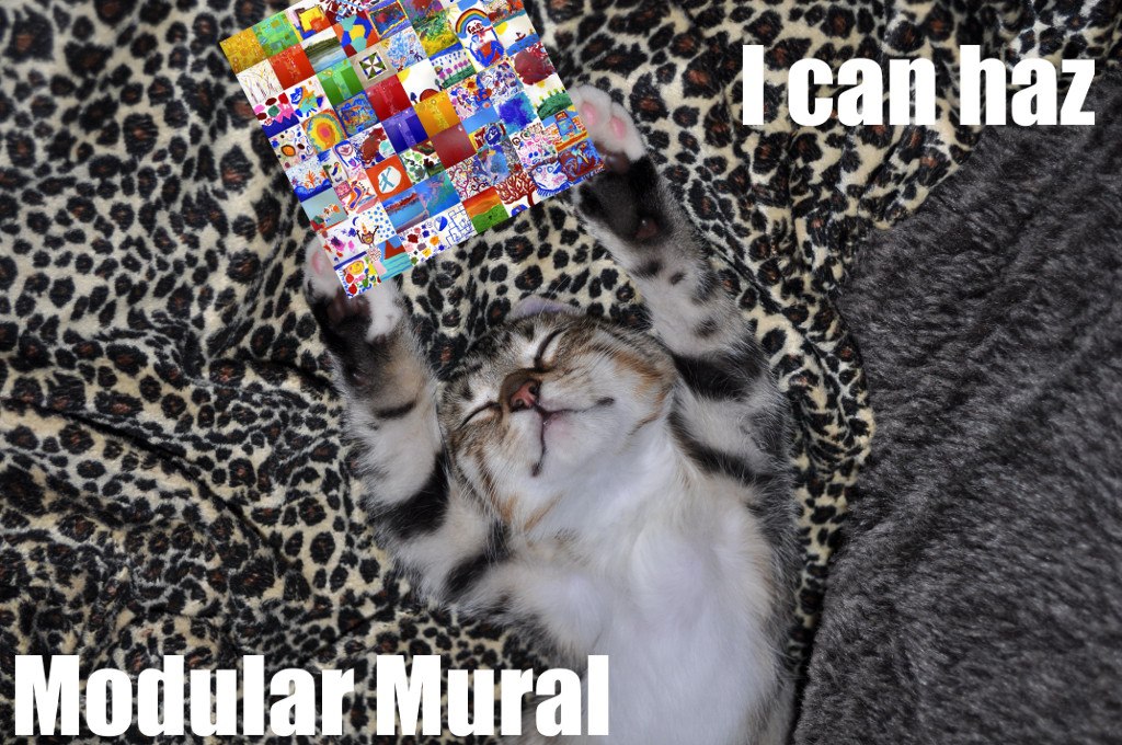 Modular Mural project at the Octagon Center for the Arts. It was held in conjunction with two other openings (“45th Annual Juried National Clay, Fiber, Paper, Glass, Metal, Wood Exhibition” and “The World in Black, White and Shades of Gray: George Christensen Retrospective”) from 5:30pm to 7:30pm. Unfortunately, our cat model declined the invitation to attend, but you should not follow suit.