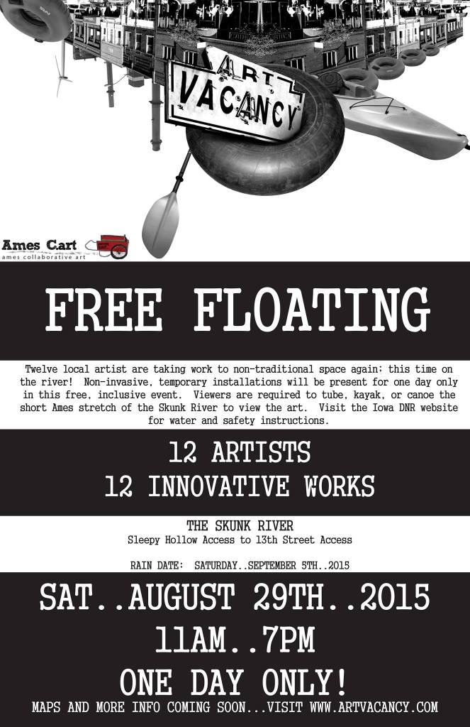 Twelve local artists are taking work to non-traditional space again: this time on the river! Non-invasive, temporary installations will be present for one day only in this free inclusive event. Viewers are required to tube, kayak, or canoe the short Ames stretch of the Skunk River to view the art.